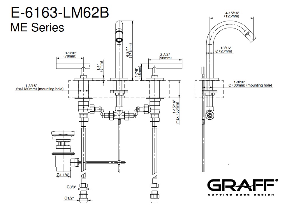 Graff M.E./M.E.25 Bateria bidetowa 3-otworowa z korkiem automatycznym Chrom E-6163-LM62B