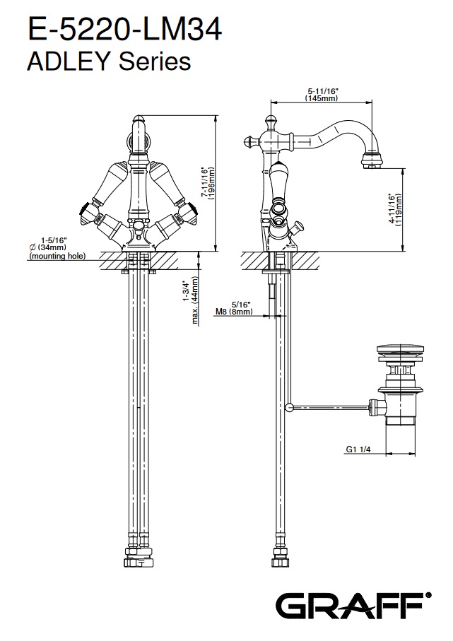 Graff Adley Bateria umywalkowa jednootworowa z korkiem Chrom E-5220-LM34
