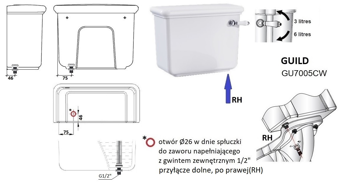 Spłuczka zawiera armaturę i rączkę w kolorze biały/chrom