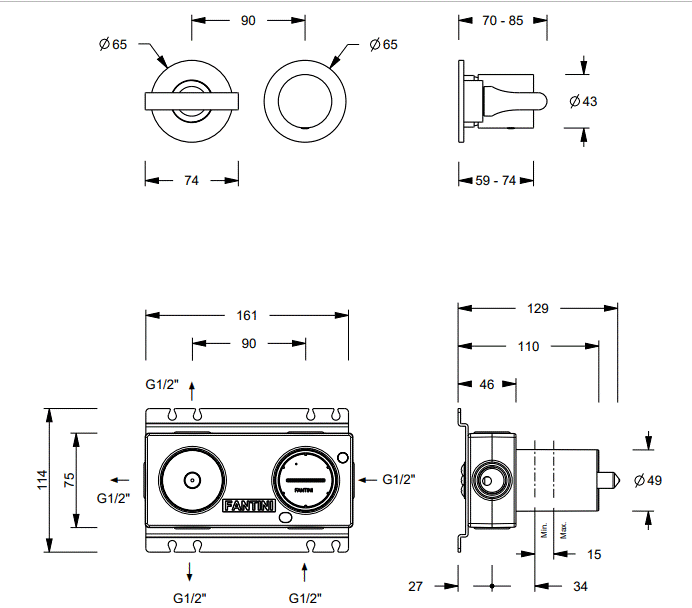 Fantini Sailing Bateria prysznicowa podtynkowa matt gunmetal pvd 67P5J087B+4400M687A