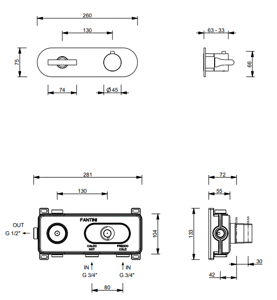 Fantini Sailing Bateria prysznicowa termostatyczna podtynkowa matt gunmetal pvd 67P5J231B+1900D331A