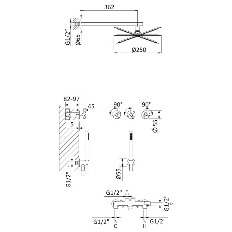 Bateria natryskowa podtynkowa z deszczownicą ścienną i zestawem: słuchawka prysznicowa, uchwyt z przyłączem