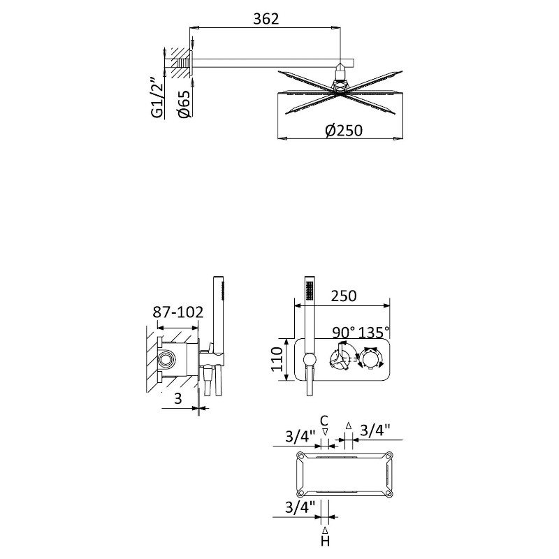 Bateria termostatyczna natryskowa podtynkowa z deszczownicą ścienną i zestawem: słuchawka prysznicowa, uchwyt z przyłączem