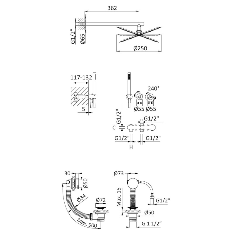 Bateria wannowo-natryskowa podtynkowa, z deszczownicą ścienna, napełnianiem przez przelew i zestawem natryskowym: słuchawka, wąż i przyłącze z uchwytem