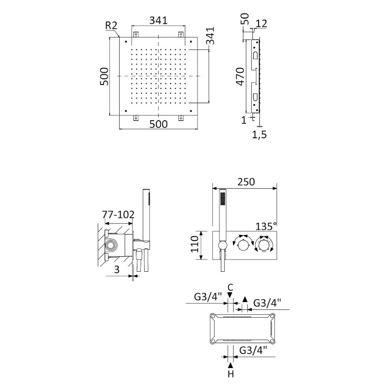 Bateria natryskowa podtynkowy, ze słuchawką prysznicową, z deszczownicą montowaną w suficie
