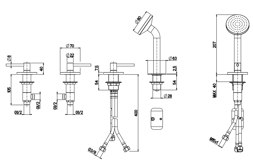 QuadroDesign FFQT Bateria wannowa na brzeg wanny 4-otworowa brushed stainless steel 2199AS