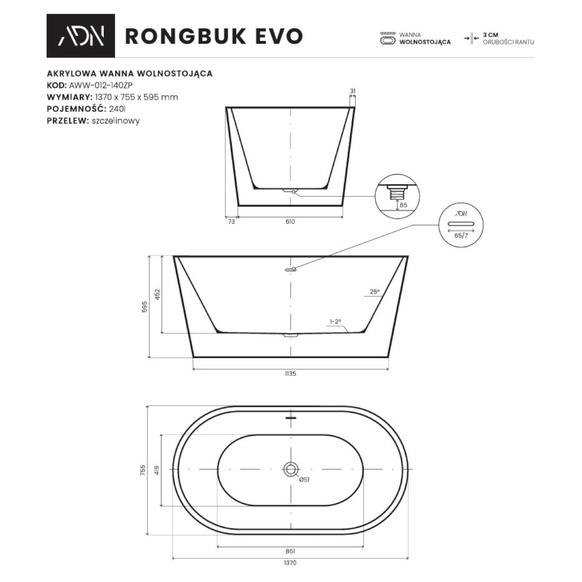 Alanad Rongbuk Evo Wanna wolnostojąca 137x75,5 cm z przelewem szczelinowym biały AWW-012-140ZP