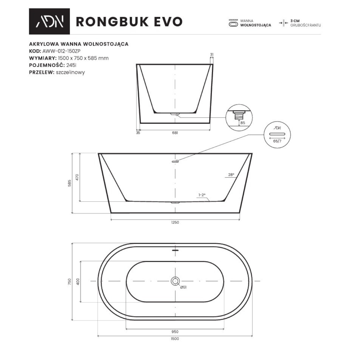 Alanad Rongbuk Evo Wanna wolnostojąca 150x75 cm z przelewem szczelinowym biały AWW-012-150ZP