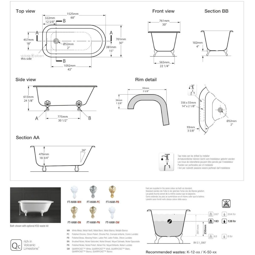 Victoria Albert Hampshire 1500 Wanna Wolnostojąca z polerowany nikiel nóżkami 152,5x76,1 cm Biała  HA1-N-SW-OF + FT-HAM-PN