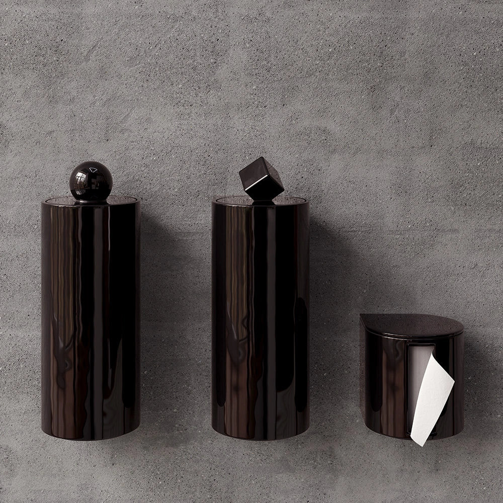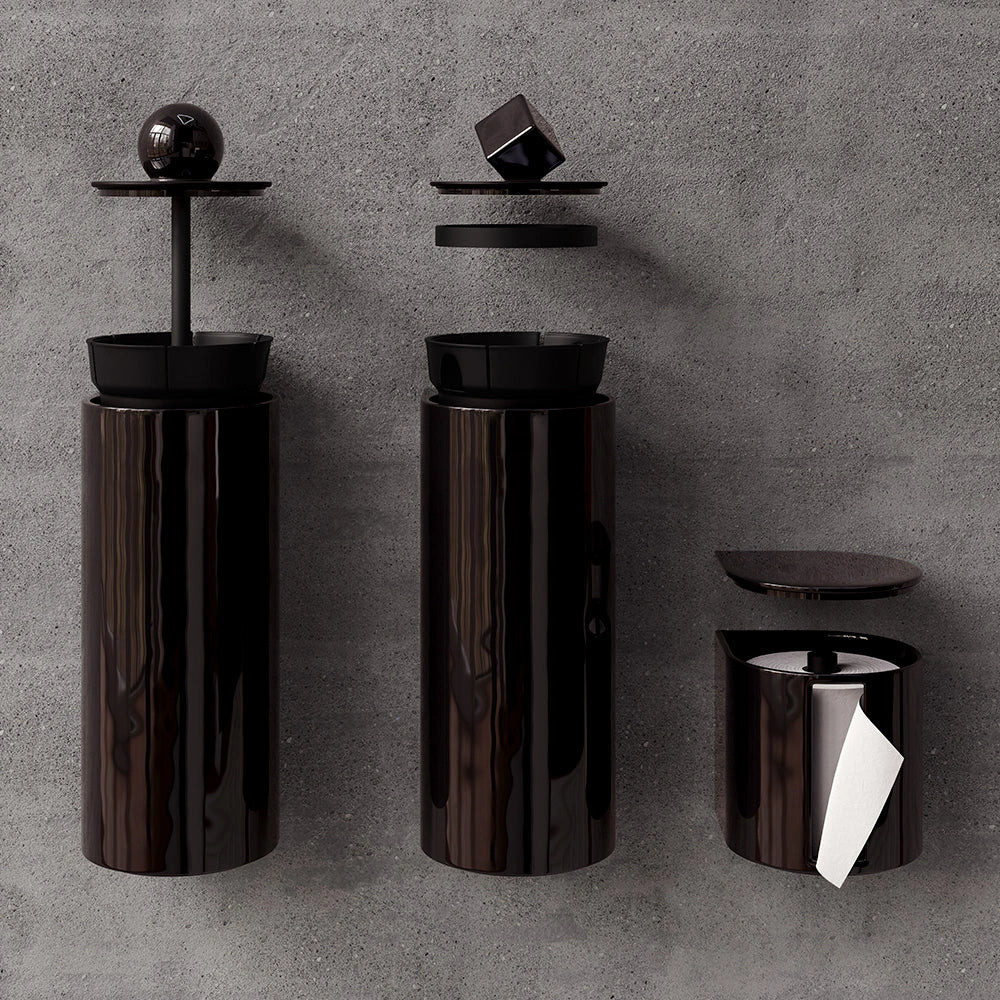 Uchwyt na papier, szczotka i kosz na śmieci: trio zaprojektowane z myślą o połączeniu stylu, higieny i wydajności.