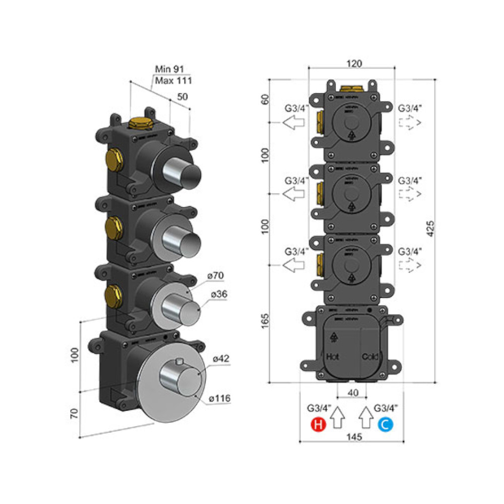 Hotbath Archie Bateria natryskowa termostatyczna podtynkowa z 3-drożna - element zewnętrzny Gun Metal PVD ARHR3.BGP