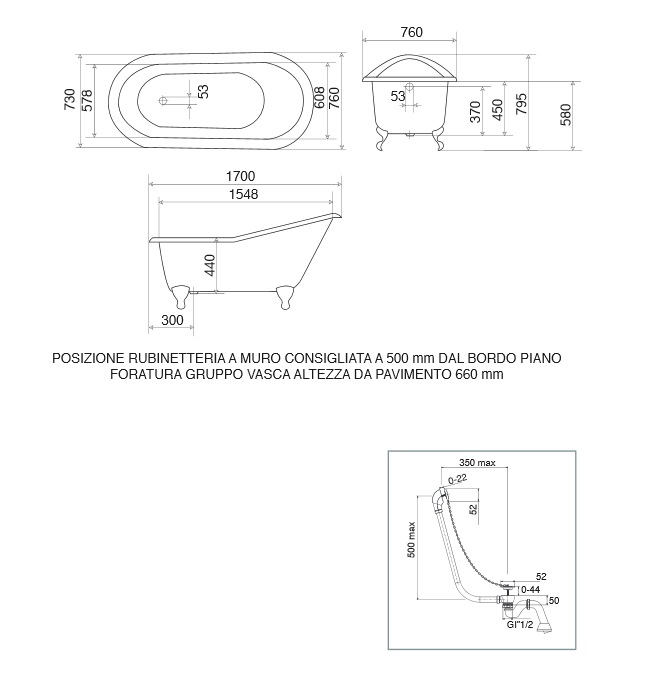Gentry Home Jasmine Wanna wolnostojąca 170x76 z nogami i syfonem biały 9148.103+9166-O+0191-O