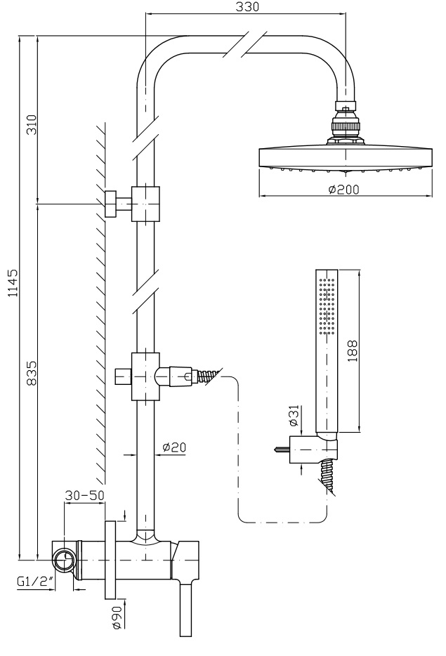 Kolumna natryskowa z jednouchwytową baterią oraz głowicą natryskową.