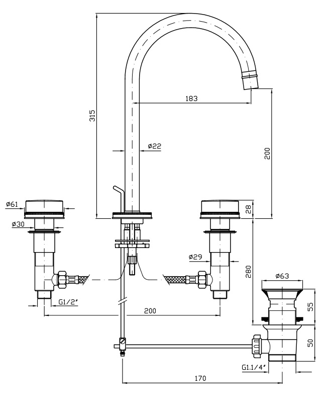 3-otworowa bateria umywalkowa z perlatorem, korek 1 ¼”, wężyki elastyczne, rozeta karbowana.