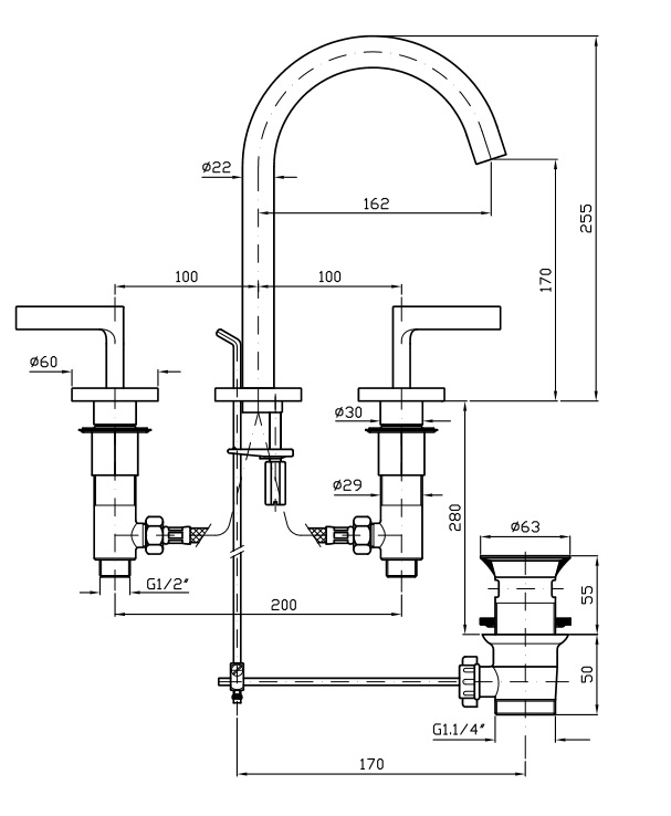 3-otworowa bateria umywalkowa z perlatorem, korek 1 ¼”, wężyki elastyczne.