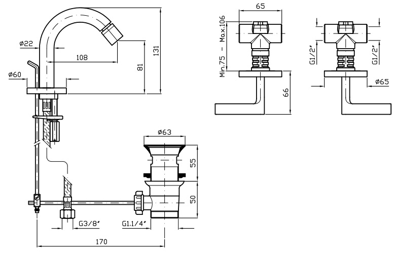 Bateria bidetowa podtynkowa z wylewką nablatową, korek 1 ¼.