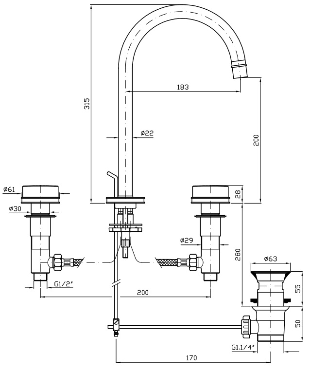3-otworowa bateria umywalkowa, korek automatyczny, elastyczne, rozeta gładka.