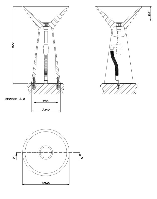 Wolnostojąca umywalka z odpływem podłogowym.