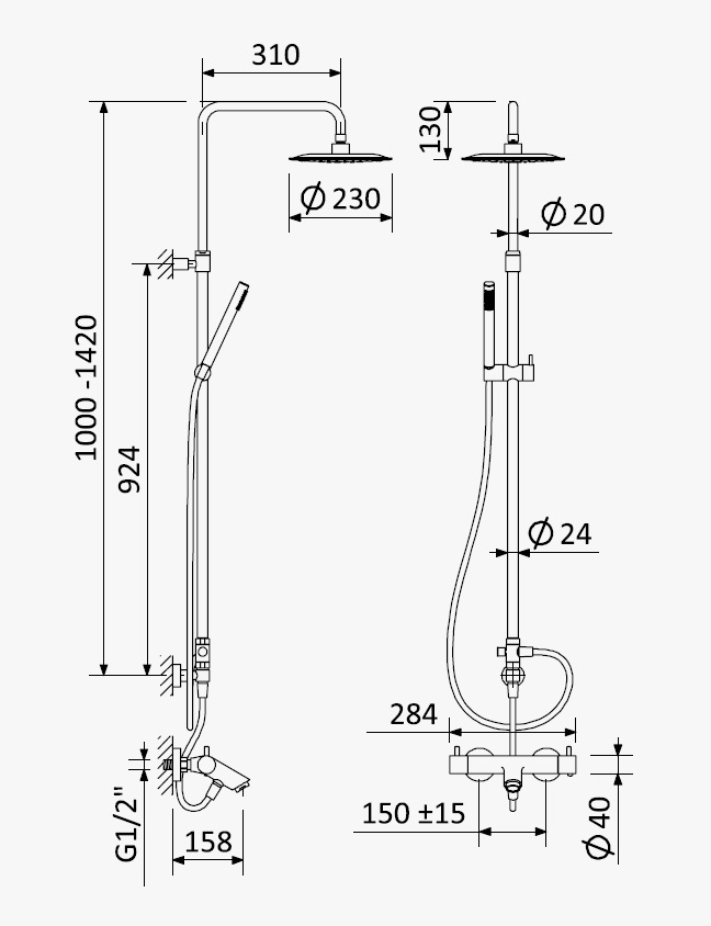 Zestaw wannowo-natryskowy z deszczownicą, regulowanym ramieniem, baterią termostatyczną i słuchawką.