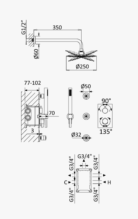 Bruma Elo Zestaw natryskowy termostatyczny podtynkowy z deszczownicą Ø 250 mm ścienną i dyszami ściennymi Chrom 1389103CR