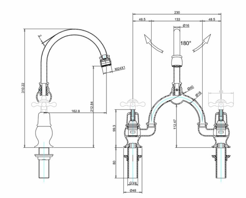 Burlington Bateria umywalkowa 2-otworowa z głowicą ceramiczną bez pokręteł chrom T25-QT