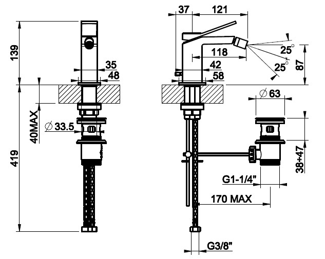 Gessi Rettangolo K Bateria bidetowa jednootworowa z korkiem chrom 53007.031