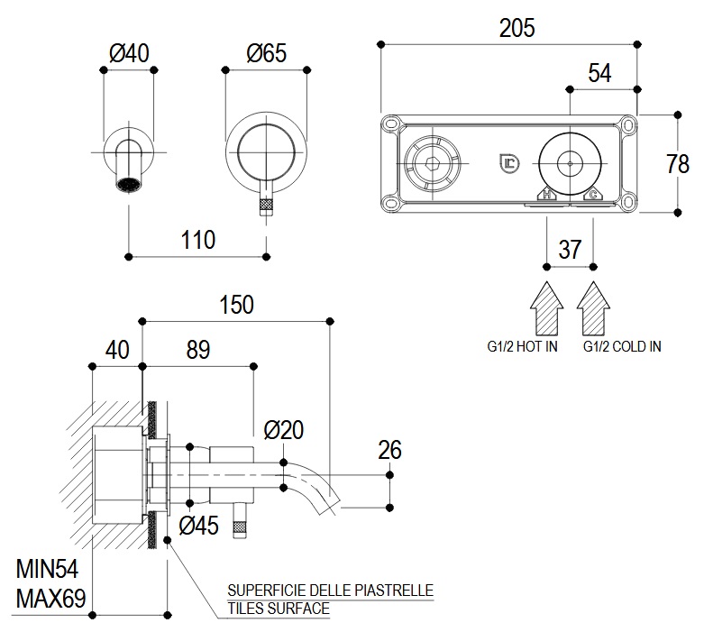 Ritmonio Diametro35 Bateria umywalkowa ścienna podtynkowa stal nierdzewna E0BA0116SPC