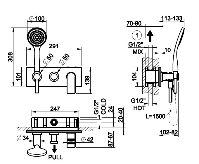 Gessi Rilievo Bateria wannowo-prysznicowa ścienna element zewnętrzny chrom 59141.031