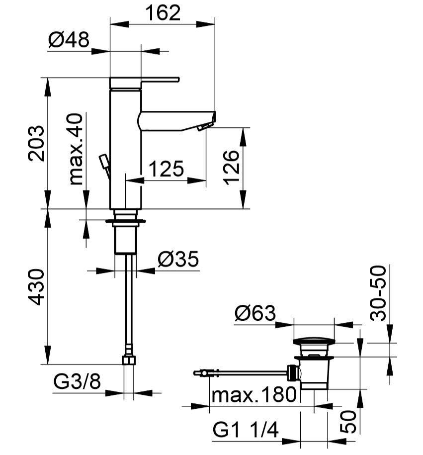 wysięg wylewki: 125 mm