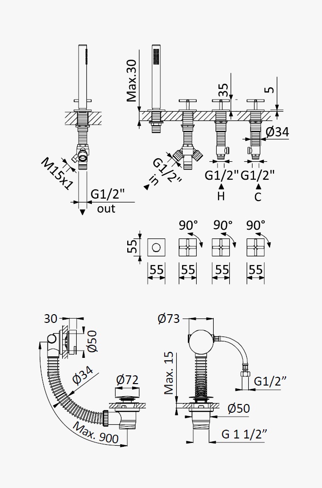 Długość odpływu: max 900 mm