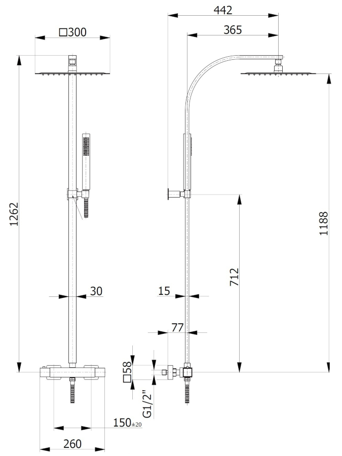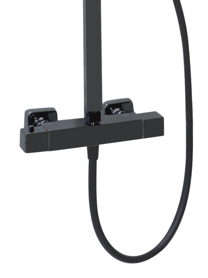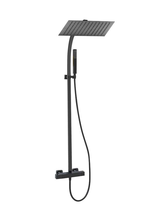 Zestaw zawiera baterię termostatyczną, deszczowicę ABS, drążek ścienny, wąż i słuchawkę.