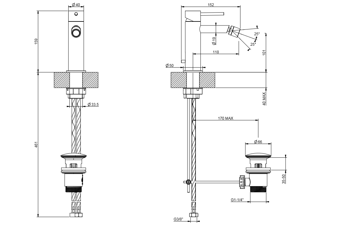 Gessi 316 Flessa Bateria bidetowa jednootworowa z korkiem Steel Brushed 54007.239