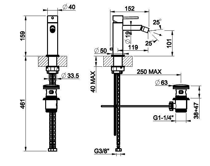 Gessi 316 Meccanica Bateria bidetowa jednootworowa z korkiem steel brushed 54207.239