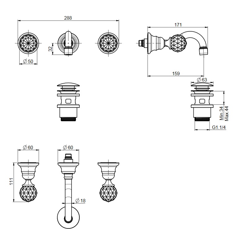 Carlo Frattini Elizabeth Chic Bateria umywalkowa podtynkowa wylewka 160 mm z korkiem automatycznym Chrom F5081/5CCR