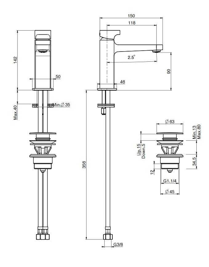 wysięg wylewki: 118 mm