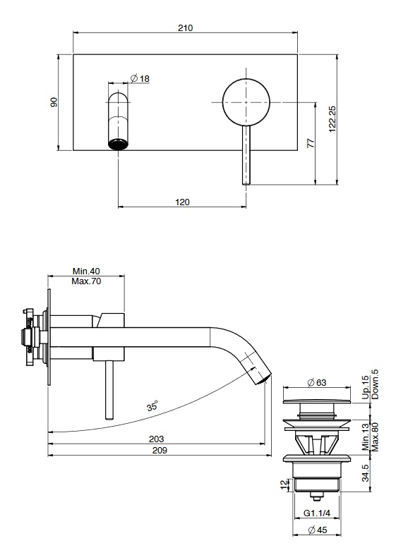 wysięg wylewki: 203 mm