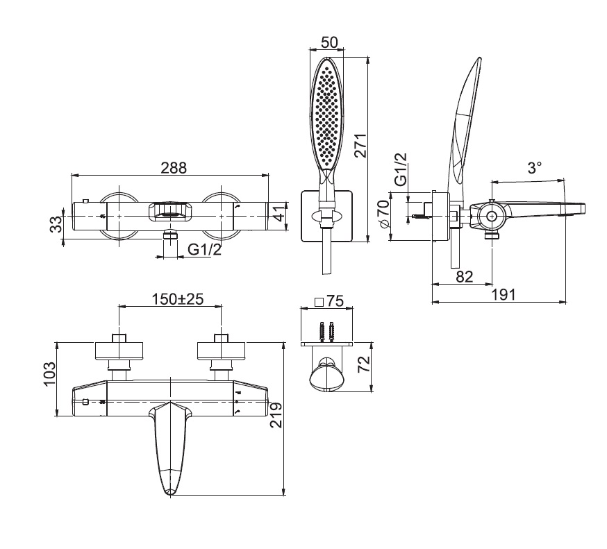 Carlo Frattini Bateria wannowo-natryskowa termostatyczna ścienna z zestawem natryskowym Chrom F4204CR