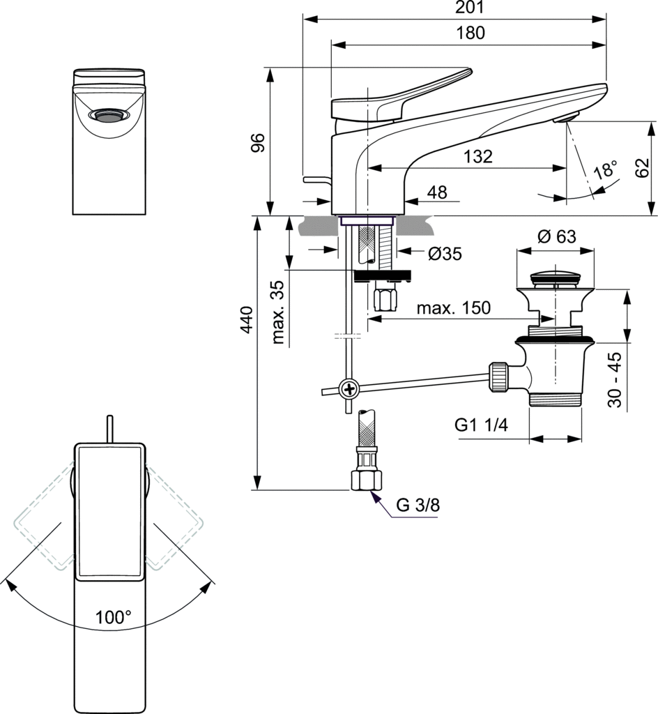 Ideal Standard Conca Bateria umywalkowa jednouchwytowa z korkiem automatycznym Czarny mat BC753A5