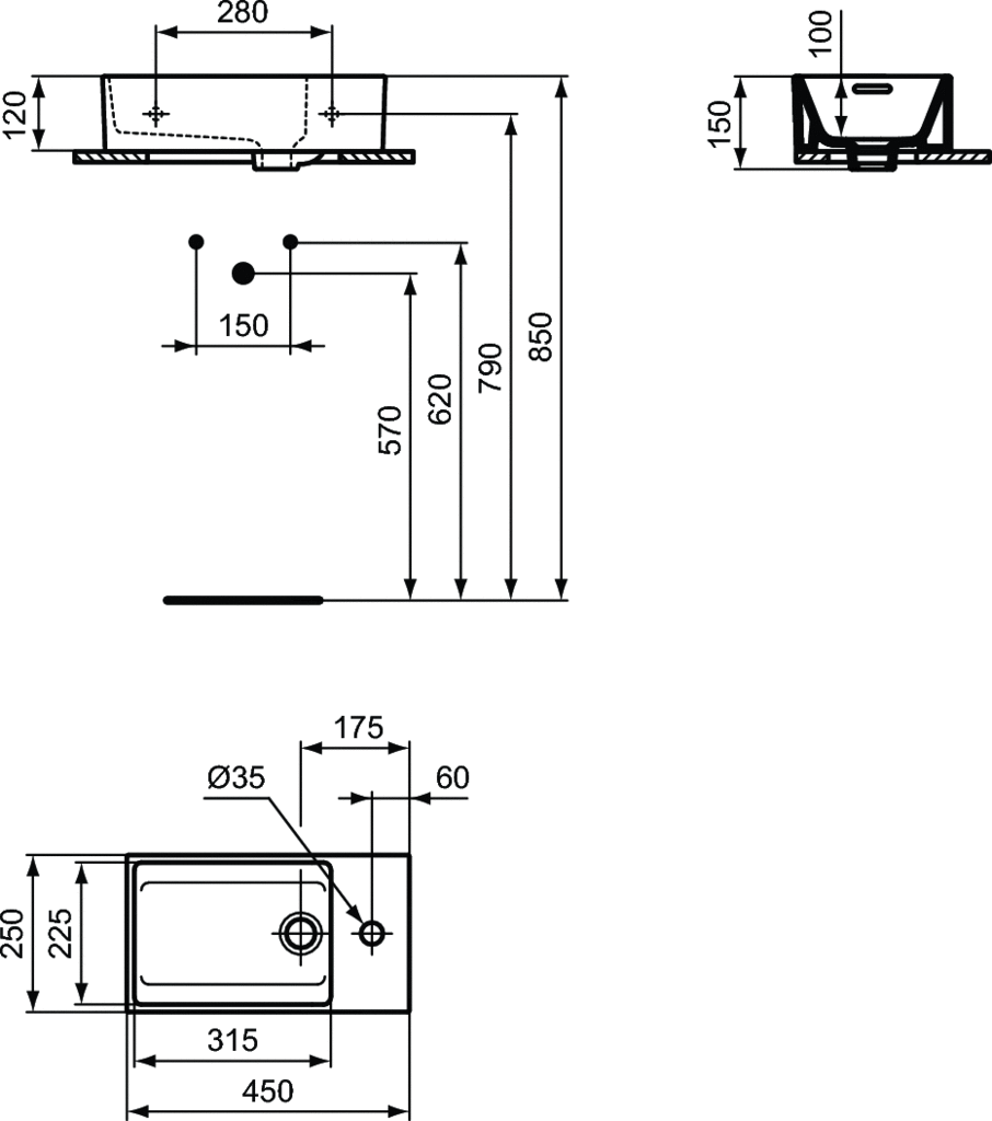 Umywalka mocowana do ściany (nie szlifowana od spodu). Wersja prawa, z otworem na baterię po prawej stronie, otwór przelewowy.
