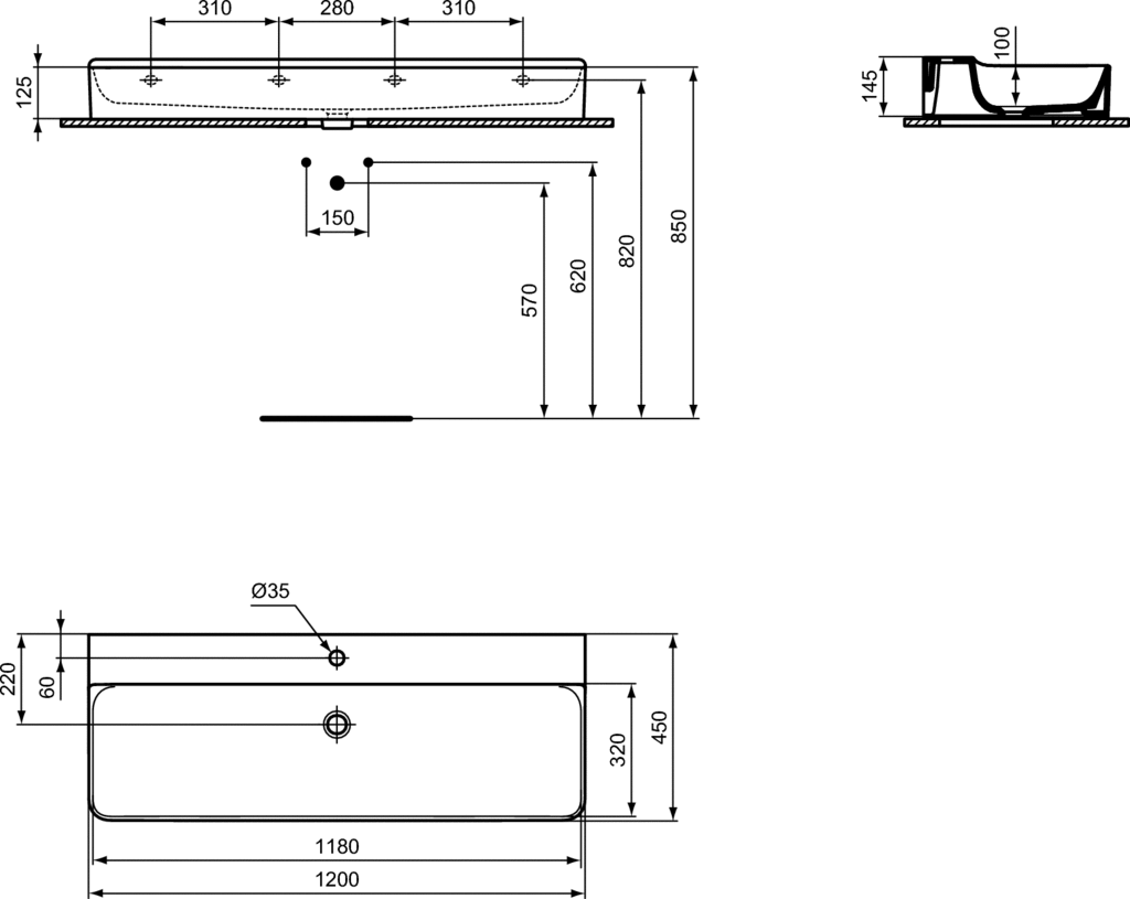 Ideal Standard Conca Umywalka ścienna 1200x450 mm z otworem na baterię Biały T380601