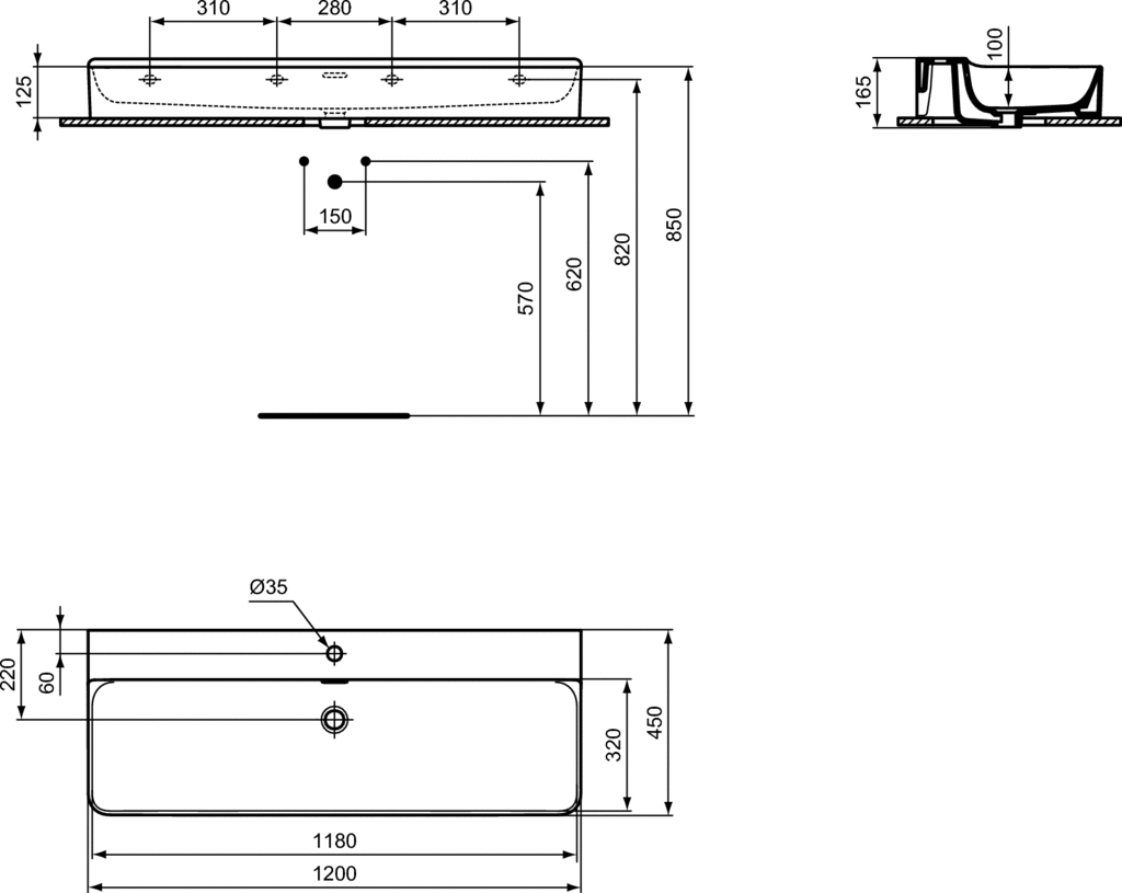 Ideal Standard Conca Umywalka ścienna 1200x450 mm z otworem na baterię Biały T383801