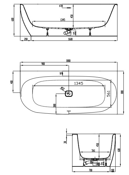 HOESCH iSensi Wanna akrylowa przyścienna/narożna prawa typu monoblock z obudową, z przelewem szczelinowym z dedykowanym systemem hydromasażu powietrznego 180x80 cm biała 3835i