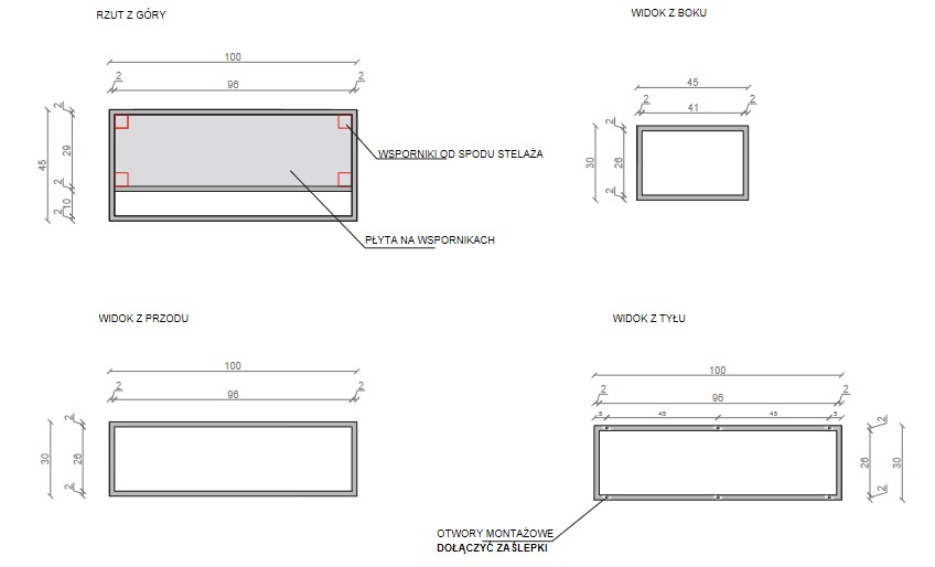 Stelaż będzie idealnym dodatkiem do umywalek w rozmiarze 100 × 45, a dzięki dodatkowej półce, pomieści najważniejsze rzeczy. Metalowa półeczka została zaprojektowana tak, aby można było na niej ułożyć dodatkowe ręczniki, kosmetyki lub niezbędne środki czystości.