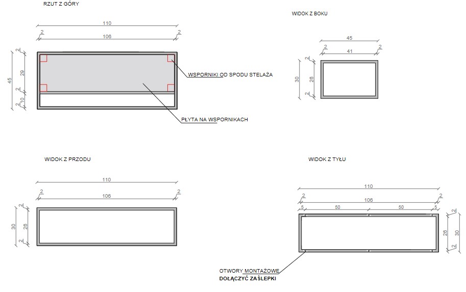 Stelaż będzie idealnym dodatkiem do umywalek w rozmiarze 110 × 45, a dzięki dodatkowej półce, pomieści najważniejsze rzeczy. Metalowa półeczka została zaprojektowana tak, aby można było na niej ułożyć dodatkowe ręczniki, kosmetyki lub niezbędne środki czystości.