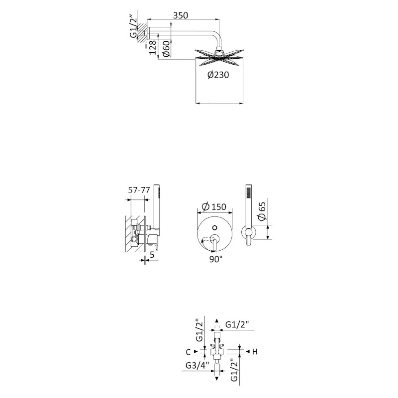w skład zestawu wchodzi: deszczownica ścienna, bateria podtynkowa, słuchawka, wąż i przyłącze z uchwytem